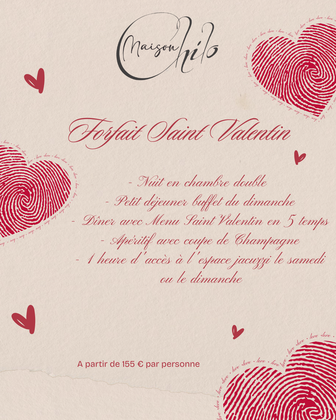 Découvrez notre menu Saint-Valentin servi le samedi 14 février pour le déjeuner et le dîner et notre séjour romantique avec une nuit, dîner et services inclus.